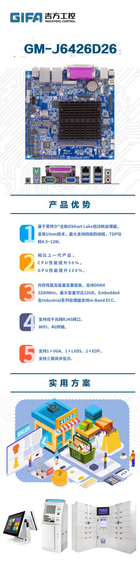 零售、自助、一體機、工業控制等行業的主板GM-J6426D26,通過充沛的算力、豐富的擴展接口以及成熟有效的單主機多虛擬機技術,將電子價簽基站、安全監控、自助收款機等眾多數字化設備,以及其中的管理應用和業務數據有機融合在一起,為門店的數字化管理提供了可靠保障。