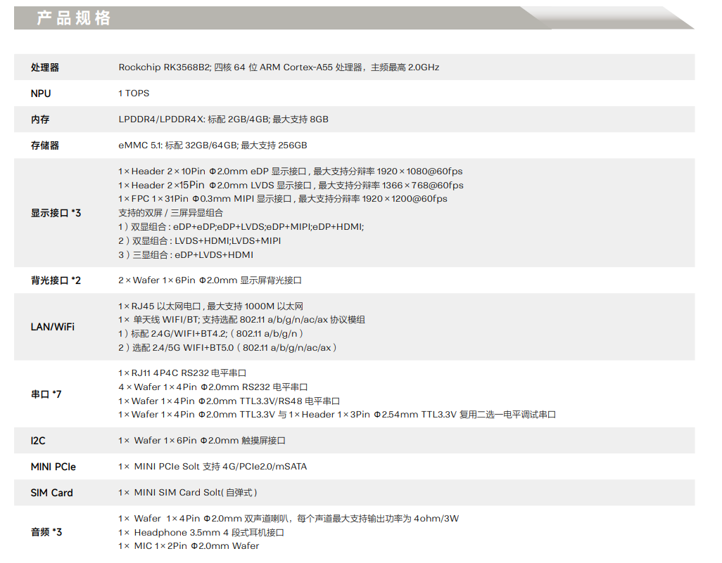 采用瑞芯微 RK3568B2 四核 64 位 Cortex-A55 處理器, 主頻最高2.0GHz,效能有大幅提升;采用 22nm先進工藝,具有低功耗高性能的特點